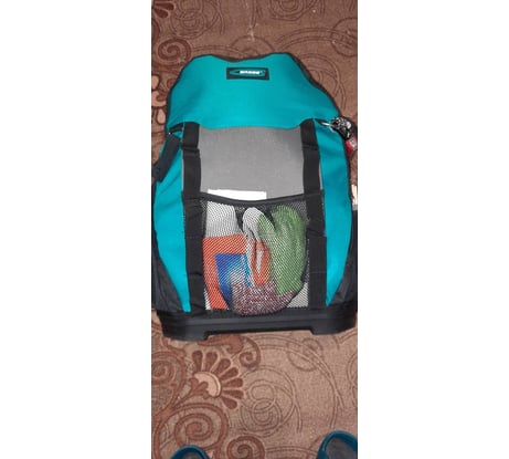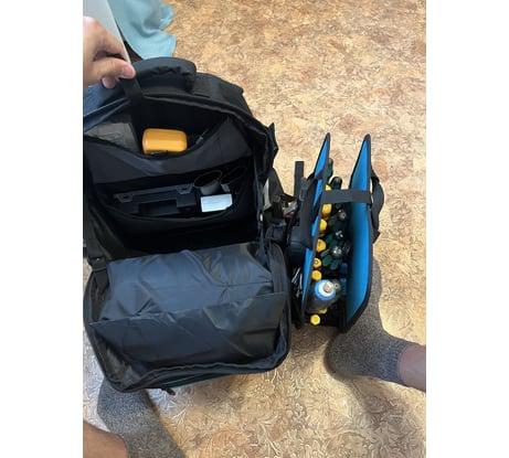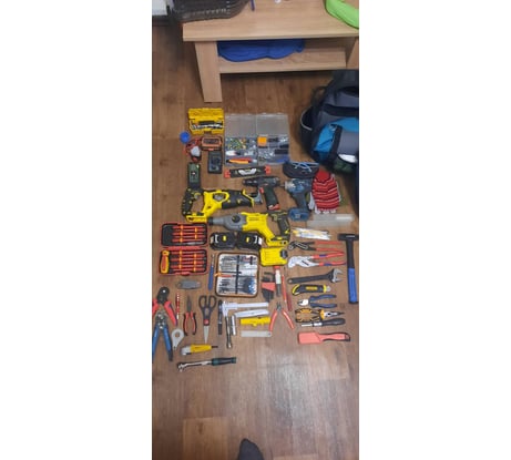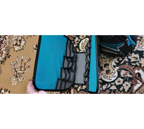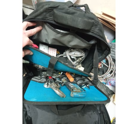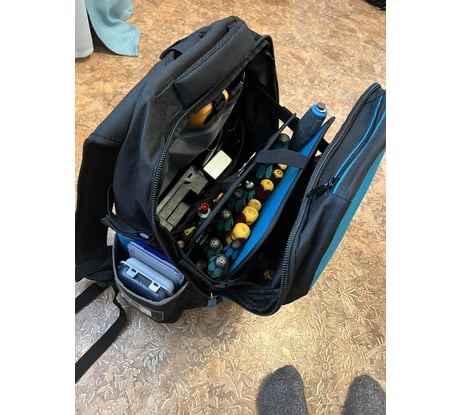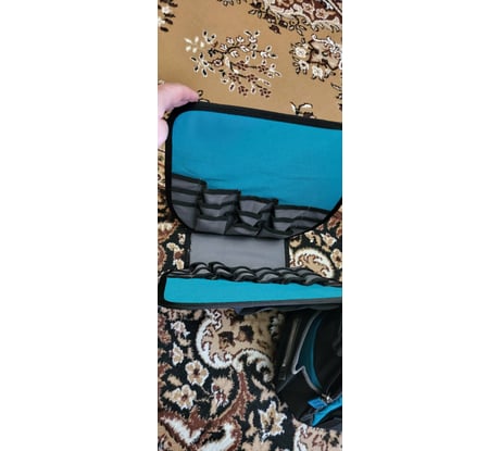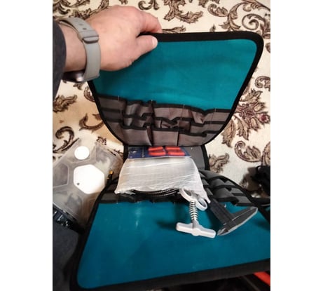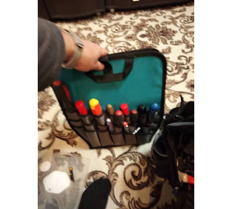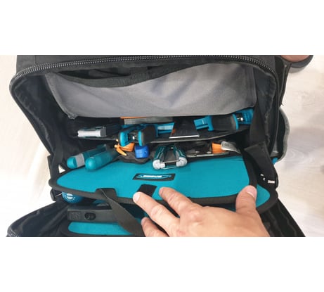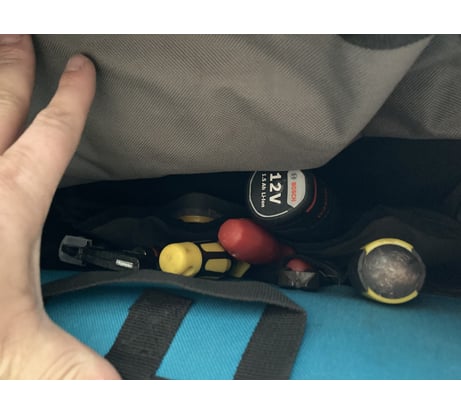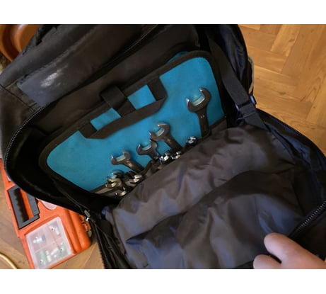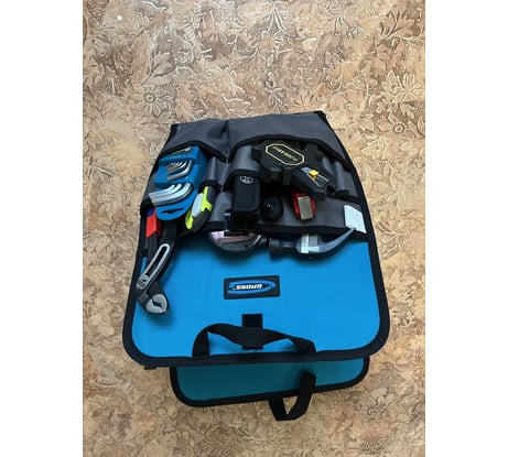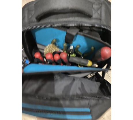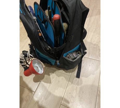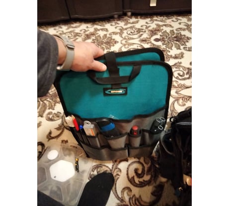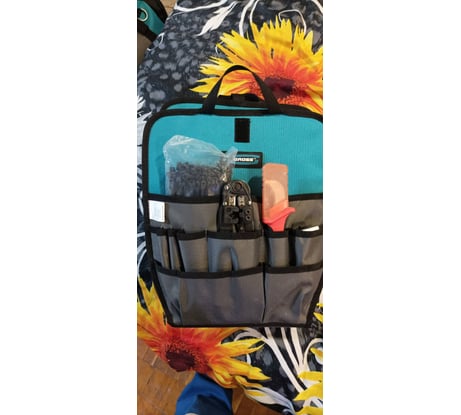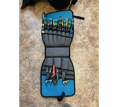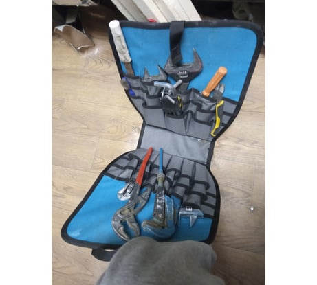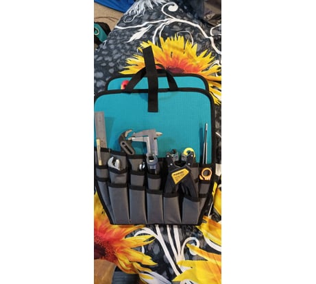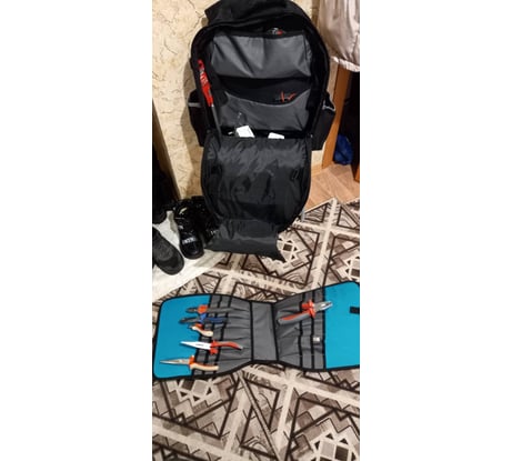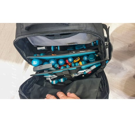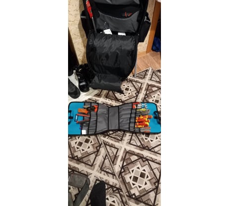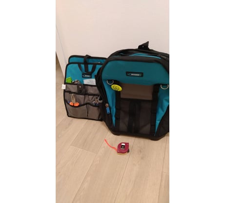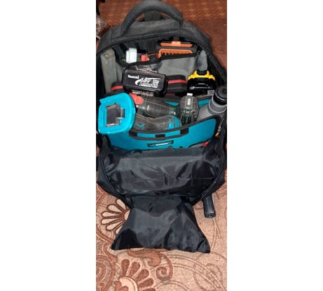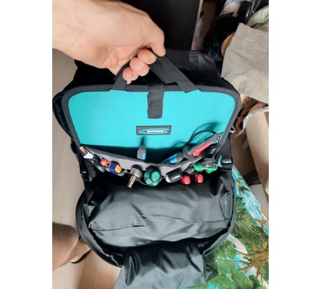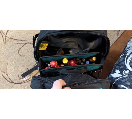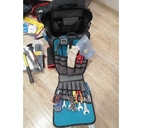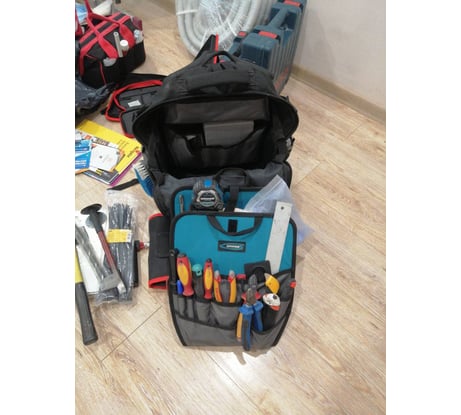 Вместительный: набор шлиц и крест диэл отвёрток, 2 ножа, бокорезы, пассатижи, многофункциональные клещи, стриппер 2 шт, ключи комбинированные 8-19, разводной ключ, переставной ключ, молоток 200гр, гвоздодёр, мини ушм + доп аккумулятор, зарядку к нему, сизы 1-4 пакет, диски к ушм, зарядка к телефону, изоленты 3шт на липучке сбоку, уровень там же, бокс с 3мм саморезами разной длинны для установки розеток, микрофибру, влажные салфетки, 2 вида бумажного скотча, бокс с битами, трещётку1/⁴, удлиннитель-отвёртка 1/4,,мультиметр-клещи, тестер розеток, 2 индикатора однополюсных, маркеры, ручку, перекись в виде карандаша, фонарик складной на магните и налобный, иногда Шурик.если иду без монтажного пояса. Итоговый вес 19,7-20,2кг и носка вполне комфортна.