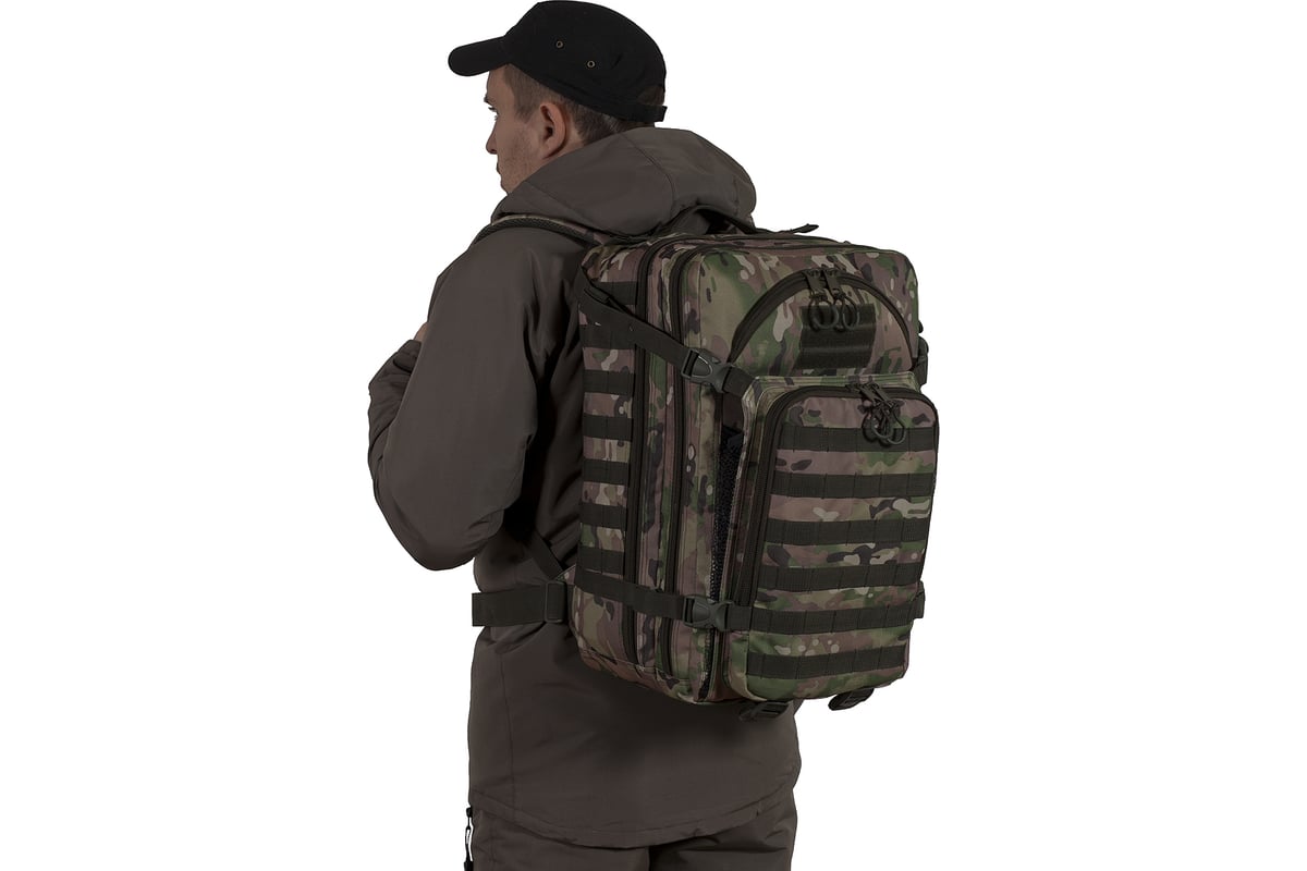 Вместительный тактический рюкзак увеличенного объема со съёмным поясным ремнём. Данная модель рассчитана на использование в полевых условиях, и в городе. Тыльная сторона рюкзака обшита сетчатой тканью с воздуховодом, что поможет спине дышать при активных физических нагрузках и в жаркую погоду. Большое количество отделений и карманов отличает эту модель от предыдущих в линейке.