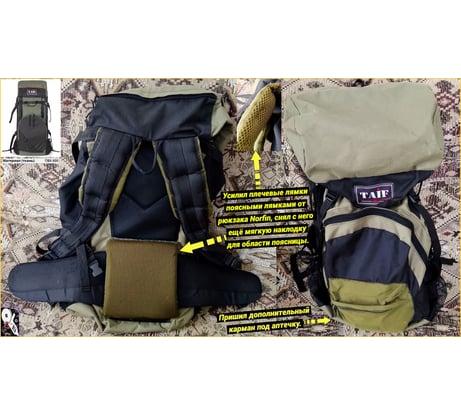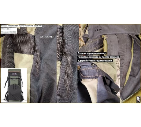 Рюкзак Taifhunter Турист Лайт 1 на 80 литров покупал у Вас в середине сентября 2025 года. Приобретал его для поездок на дачу и объекты. Габариты 310х260х780 мм. Основное отделение на затяжке сверху, два боковых сетчатых кармана, объёмный фронтальный карман на молнии, большой карман на молнии в клапане. По две боковых стяжки с каждой стороны. Петли для снаряжения. Произведён рюкзак в России в городе Киров. Рюкзак дополнил небольшим карманом с молнией от рюкзака Norfin, нашил его на фронтальный карман, перед этим отпоров петли для снаряжения за ненадобностью. Расположил в кармашке аптечку. Сетчатыми боковыми карманами я не пользуюсь, кармашки подобного плана мне не нравятся. Предпочитаю карманы из основного материала с клапанами и/или на молнии. Данный рюкзак Taifhunter не рекомендую к покупке, а производителю советую задуматься над качеством используемых материалов для выпускаемых рюкзаков. Хорошая задумка накрылась медным тазом. С уважением, Ваш постоянный клиент!