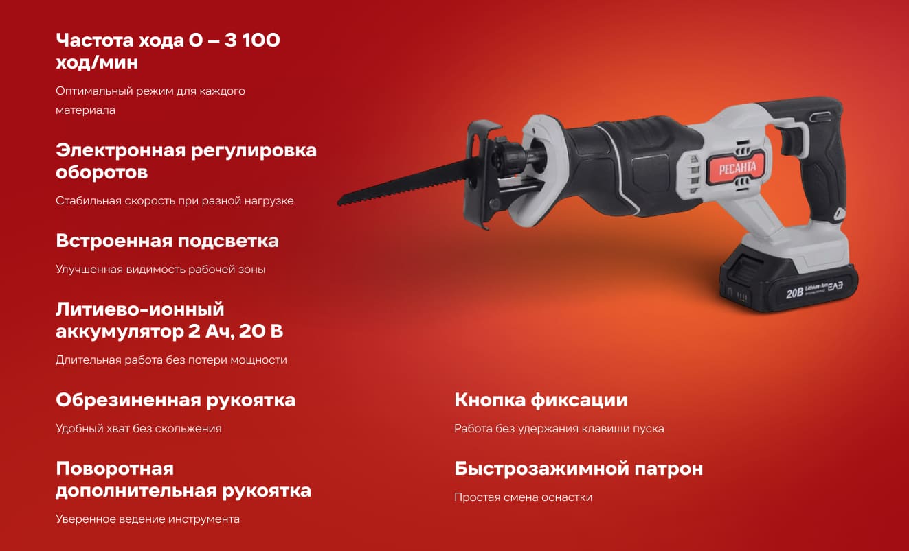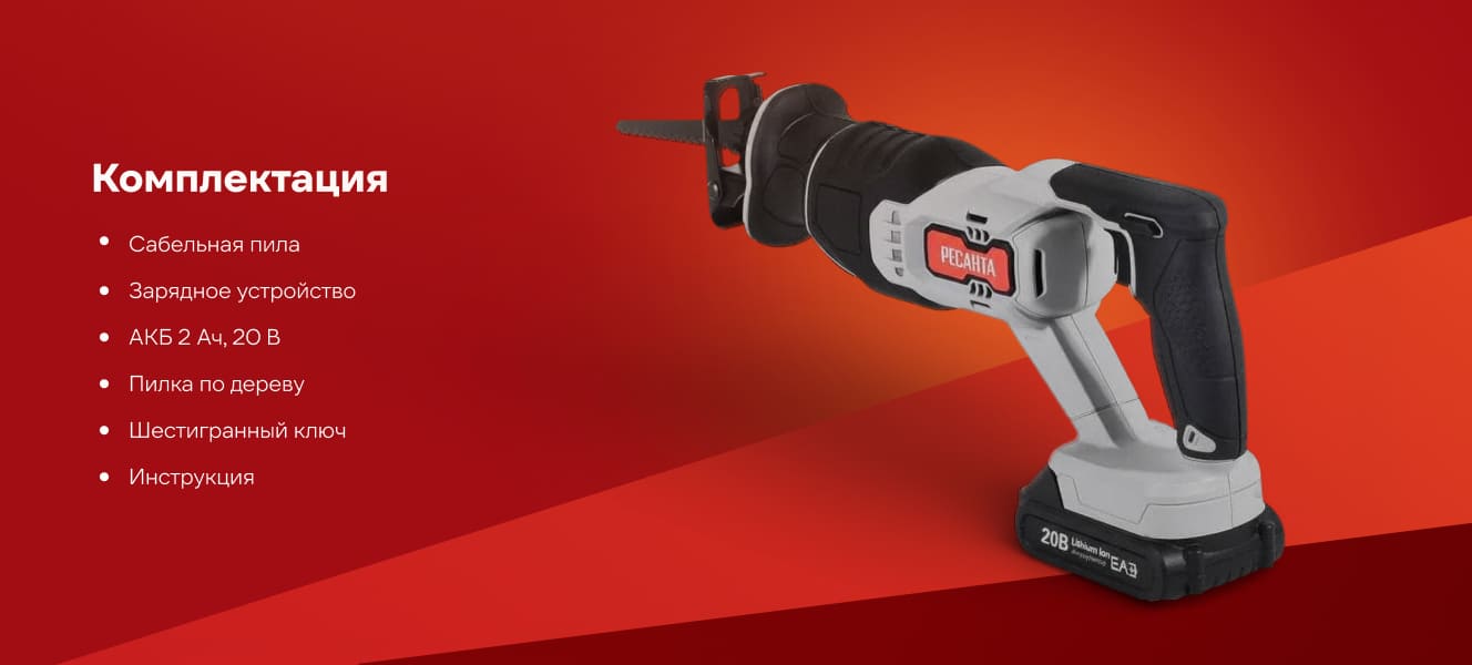 Сабельная пила аккумуляторная Ресанта АСП-20Li (в комплекте 1 АКБ и ЗУ) ЕА+ 75/25/2