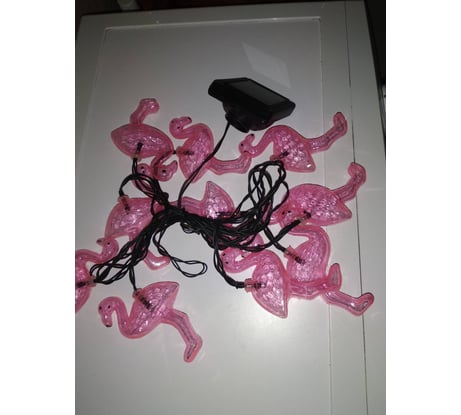 Заказ пришел быстро, без задержек. В цветной коробке гирлянда из 10 пластмассовых розовых фламинго, батарея зарядная, 1 колышек для крепления. Батарея зарядились от солнца на подоконнике через стекло быстро. Кнопкой включается 2 режима: постоянный свет и мигающий. Ночью смотрится красиво. На даче гирлянда будет смотреться оригинально. Качество понравилось, рекомендую к покупке.