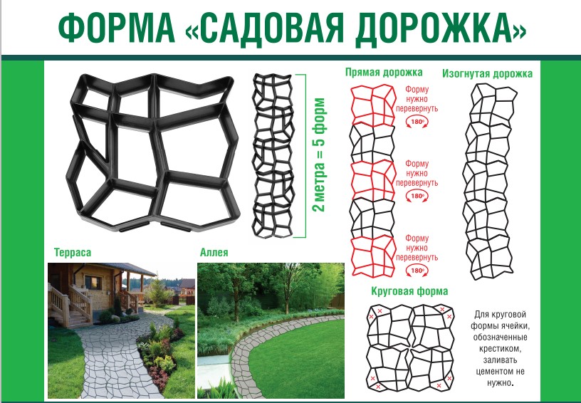 Наземные покрытия для сада. С помощью формы для тротуарной плитки вы легко и быстро сделаете удобную дорожку в саду, около дома или на детской площадке. Форму для садовых дорожек можно использовать также для мощения террас, зон отдыха, зон для барбекю и стоянок. Благодаря компактному размеру вы можете делать не только широкие дорожки между постройками, но и узкие, например, около грядок. Размер одной штуки: 44*44 см, толщина 40 мм.