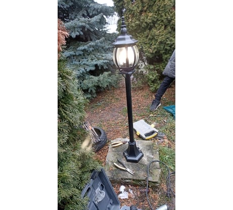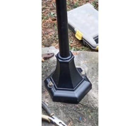Слабенький, небольшой фонарный столбик, провод внутри имеется, останется установить подножку с помощью 2 анкеров, подсоединить, вкрутить лампочку, прикрутить крышку и готово. Устанавливается на бетонное основание. На черном основании не очень смотрятся золотые торчащие болты. Лучше устанавливать там, где никто не будет трогать лишний раз.