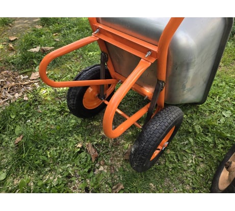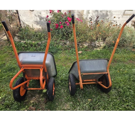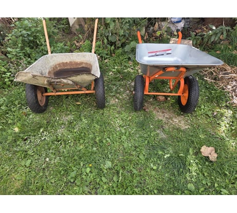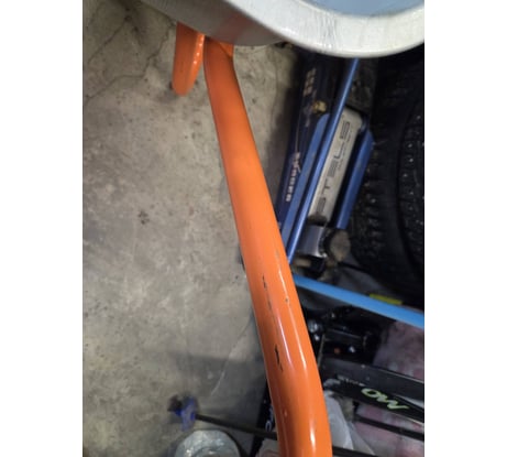 Неплохая тачка. Оставляет впечатление надежной. Этого же производителя тачка в эксплуатации 15 лет, очень надежна и удобна, поэтому искал именно строймашевскую тачку. Но новая оказалась другая. Другая конструкция, другие трубы, другое корыто. Как покажет себя в эксплуатации-посмотрим. Но по опыту решил сразу усилить передний борт корыта и подвеску колес. При сварке оказалось, что трубы тонкостенные. Увеличилась погрузочная высота и поднялся центр тяжести, что я считаю отрицательным моментом. На фото показал отдельные моменты качества производства: плохая покраска, криво приваренные ограничители колес. Ну и бонусом сравнение с 15летней тачкой, используемой и в хвост и гриву по хозяйству и по стройке.