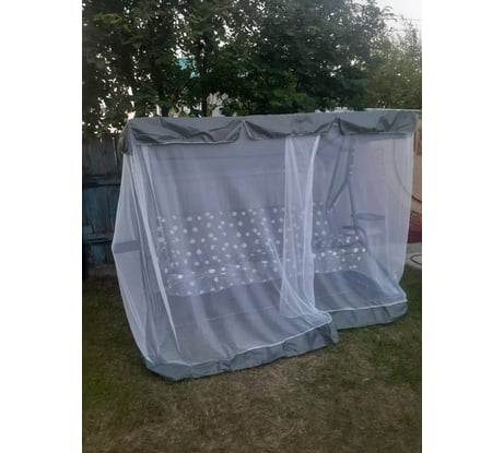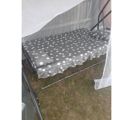 Поставила на плитки, чтобы не проваливались в землю. При сборке обращайте внимание на углубления при отверстиях, поможет правильно расположить деталь. Мне не хватает каких-нибудь зажимов, чтобы держали сетку поднятой, когда качелями не пользуешься, т.к. при опущенной сетке внутри скапливается куча летающих насекомых. Материал тента хороший, дождь не пропускает.