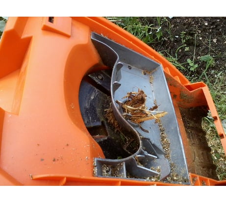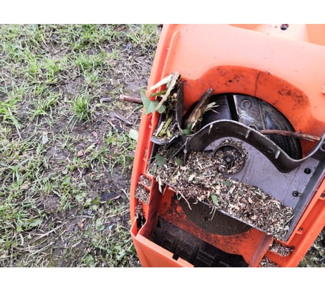 В целом работает, лучше всё же работать со свежими ветками так как они режуца легче. Ножи с коробки были тупые, но при этом ветки резало( да и сейчас купив инструмент очень часто приходится его допиливать). В коментариях писали что не могут снять ножи, в кожухе есть отверстие для стопорения диска с ножами, застопорил и открутил без проблем. Проблем с наматыванием веток небыло хоть ножи и были не острые. Ветки толще 3 сантиметров в диаметре совать смысла не вижу. Ветки необходимо подготовить, срезать лишние ответвления иначе не влезут.