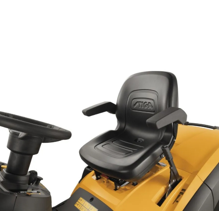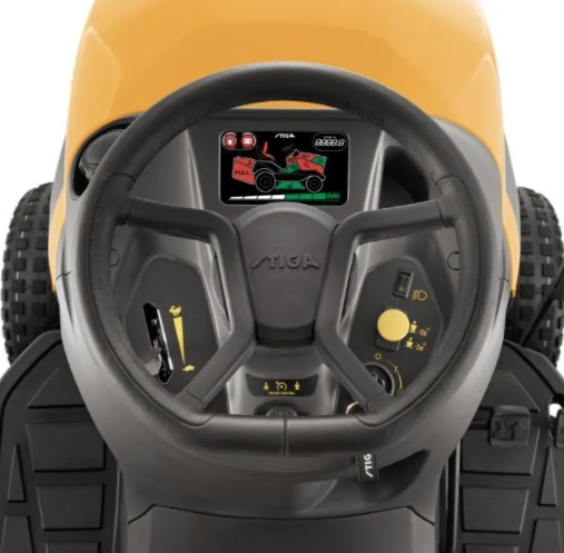 Данная модель имеет удобное приподнятое рулевое колесо и сиденье с подлокотниками для обеспечения максимального комфорта оператора. Кроме того она оснащена интеллектуальным широкоформатным дисплеем с диагональю 5.5 дюйма, который предоставляет полезную информацию обо всех важных рабочих параметрах трактора. Функция STIGA с индикатором оптимального режима работы сообщает оператору о достижении оптимальных характеристик кошения независимо от ландшафта и типа травы.