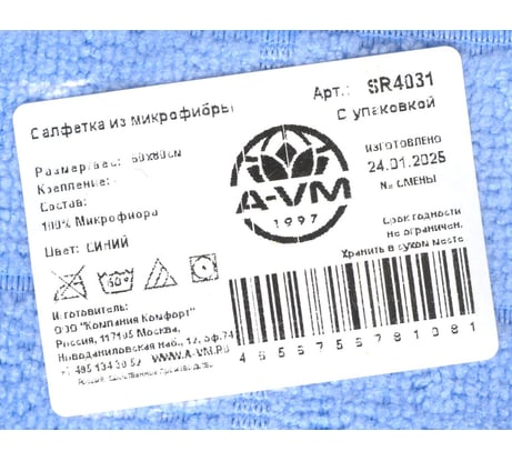 Салфетка из микрофибры A-VM 60x80 см, синяя SR4031