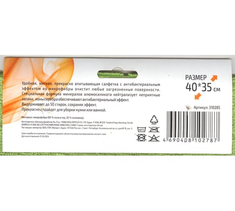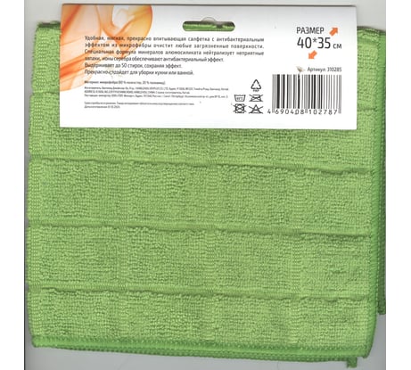 Удобная, мягкая антибактериальная салфетка из микрофибры очистит и продезинфицирует любые загрязненные поверхности, а также устранит неприятный запах. Специальная формула алюмосиликата нейтрализует неприятные запахи, а ионы серебра обеспечивают антибактериальный эффект. Выдерживает до 50 стирок, не теряя своих свойств.