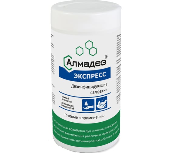 Салфетки АЛМАДЕЗ Экспресс влажные №60 140-180 мм, в банке готовые САЛ-В-11 выполнены из нетканого материала и равномерно пропитаны дезинфицирующим средством "Алмадез Экспресс".