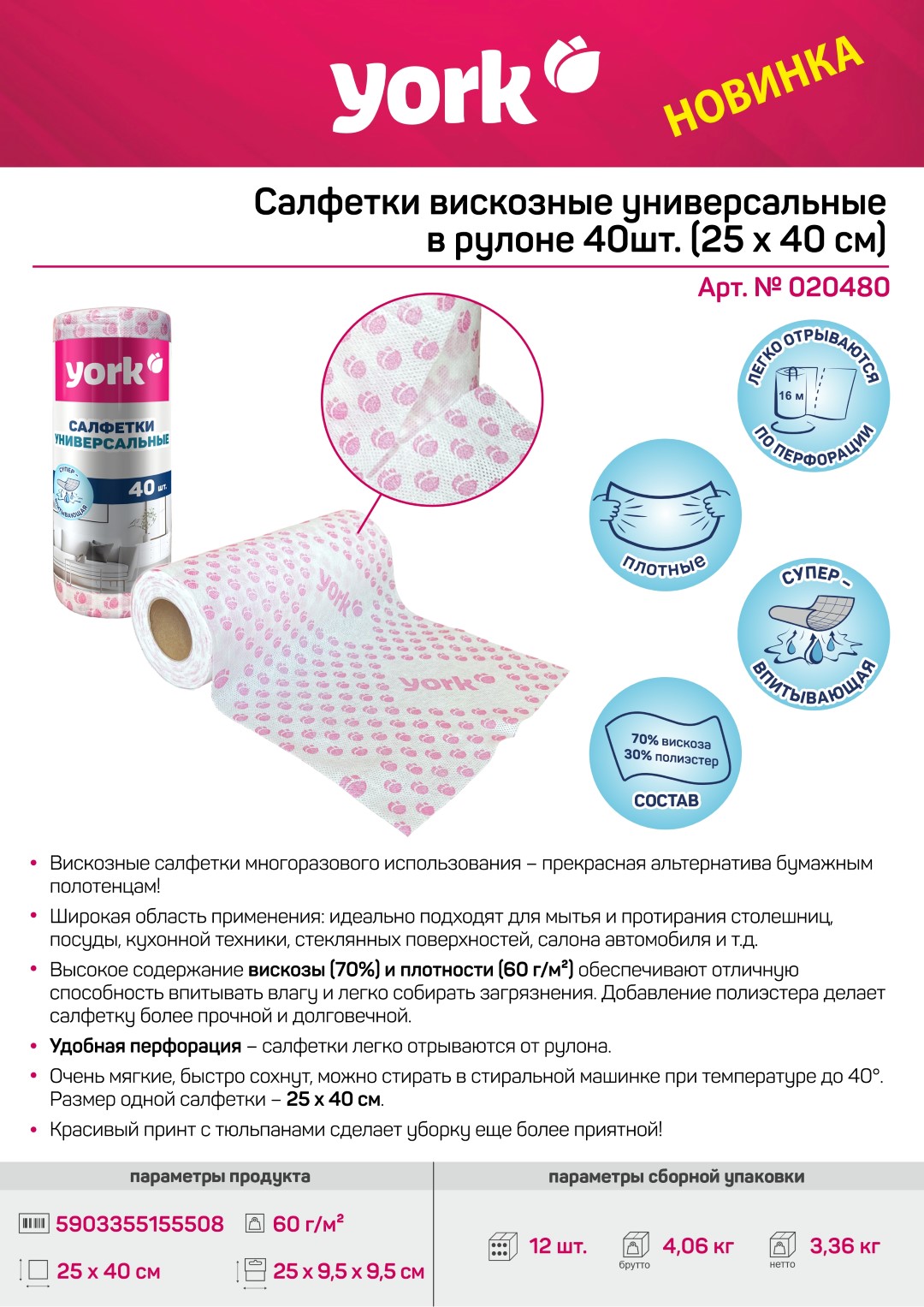 Салфетки вискозные YORK Тюльпан Премиум в рулоне 40шт. (25x40 см) 020480