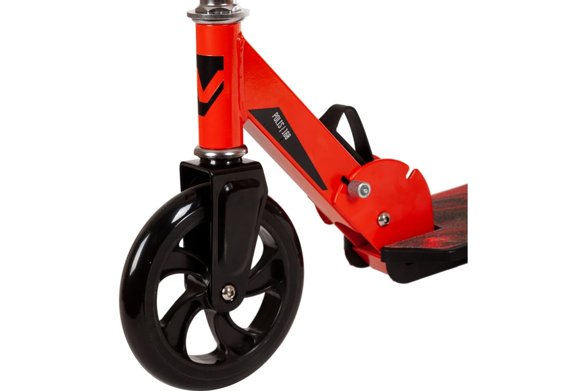 Комбинация стальной рамы с пластиковой платформой позволяет снизить вес без ущерба прочности, а удобный механизм складывания поможет при транспортировке самоката.