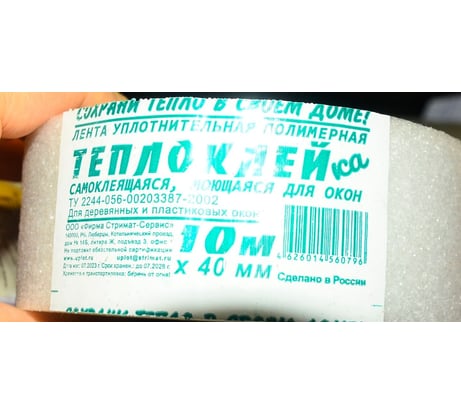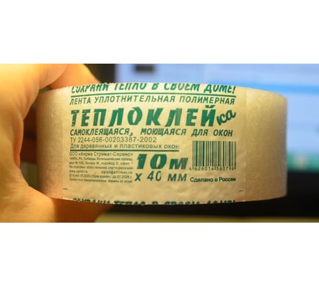Теплоклей-ка самоклеящаяся, моющаяся для окон_(для деревянных и пластиковых окон)_ 1 мм, 40 мм, 10 м (0817034). Обычная утеплительно-изолирующая лента в 4см шириной и 10м длиной, из пеноплена/пеноплекса или тп материала, плотная и ровная, тонкая, очень ровно и точно выполнена, порезана на колеса, рвется с усилием, клеевой слой слабый, но это особо и не нужно, иначе вся работа косяком пойдёт. Отрезал кусочек, сложил и подсунул с улицы под пластиковый профиль (место соединения подоконника, карниза и самого профиля, тк зимой оттуда чуток холодом тянет), - вроде сидит нормально, не вылезает и не выпадает. Буду затыкать, используя герметики и краску.