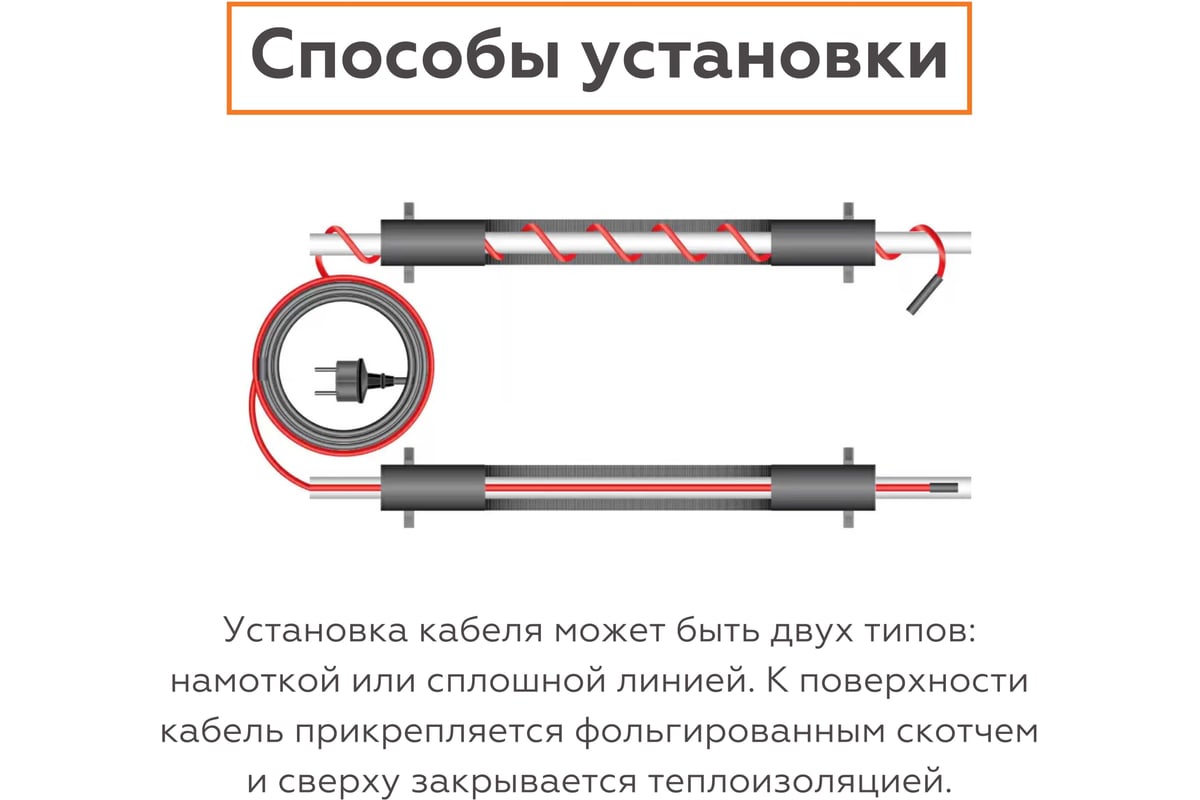 Перед установкой подготовьте кабель SRL 30-2 с помощью набора заделок КПШ. Один конец кабеля следует муфтировать капой, с другой стороны с помощью насадок присоединяется силовой шнур. После этого кабель укладывается на трубу, прикрепляется фольгированным скотчем и сверху перекрывается теплоизоляцией.