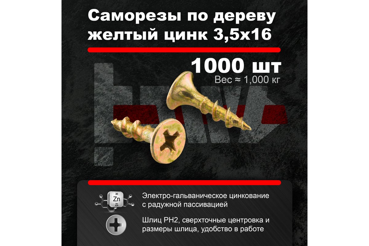 Саморезы применяются для крепления и соединения деревянных элементов, стальных пластин к деревянным основаниям. Подходят для крепления в пластмассу. Для крепления к стальным основаниям требуется предварительное сверление. Желтопассивированные саморезы применяются также для монтажа различных элементов в полнотелые и пустотелые основания совместно с распорными дюбелями. Производятся из углеродистой стали, после чего проходят процесс цинкования и пассивации.