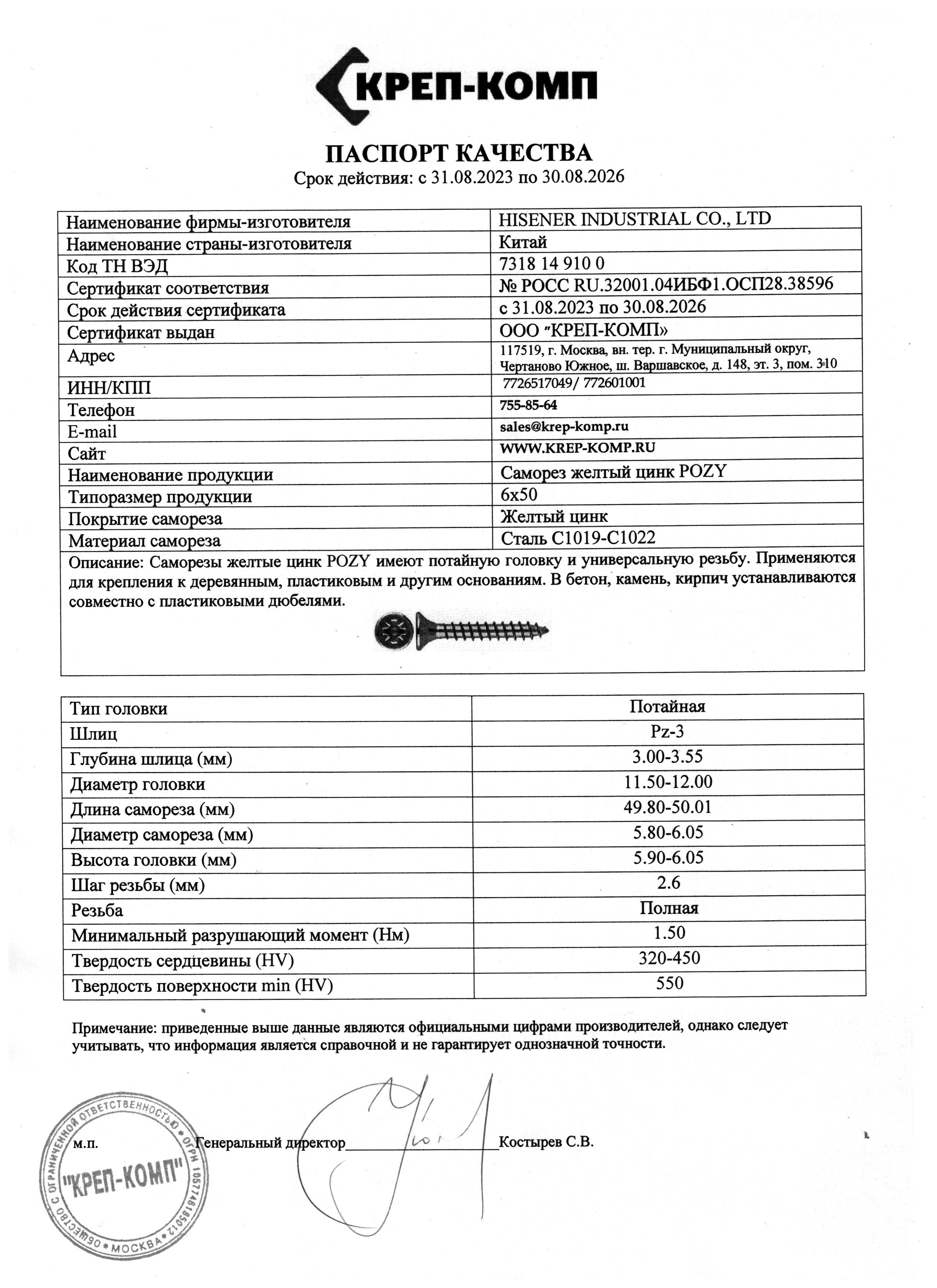 Технические характеристики самореза КРЕП-КОМП желтый цинк POZY