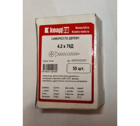 Отзывы о саморезе по дерeву для гкл КВАДРА черный, 4.2x76, PH2, редкая резьба, кop. 50 шт. 420761002050