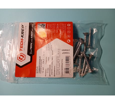 Саморезы отличного качества. В упаковке 14 штук, на упаковке точные характеристики саморезов. Изготовлены из твердого металлического сплава. Для крепления фанеры подошли идеально.