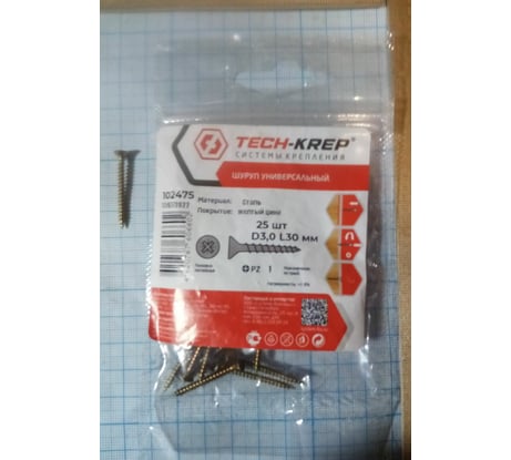 1. В общем, неплохой крепёж, за исключением головки. Есть жёлтопассивированное покрытие. Длина подходящая для моих целей. Носик в меру острый, что позволяет без проблем впиваться в дерево. 2. В качестве упаковки идёт фирменный пакет от Tech-Krep. Гриппер плотный, многоразовый и позволяет хранить мелкие предметы. По-умолчанию он запаян. Так что вскрывайте аккуратно и не впритык к замку, чтобы не повредить зажим ZIP-lock и сохранить его на будущее.