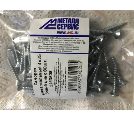 МЕТАЛЛСЕРВИС Саморез универсальный 4x25 белый цинк 80шт. МС 1265608 предназначен для общестроительных для общестроительных и ремонтных работ. Может применяться с любым материалом. С мягкими элементами (из пластмассы, дерева) вкручивается без засверливания, с твердыми (из металла) - требуется предварительное сверление. Используется совместно со всеми видами дюбелей, так как резьба имеет подходящий шаг и недостаточно острая, чтобы прорезать тело дюбеля. Цинковое покрытие обеспечивает надежную защиту от коррозии и механических повреждений. Головка потайная, при закручивании полностью утапливается в поверхность, что упрощает дальнейшую отделку.