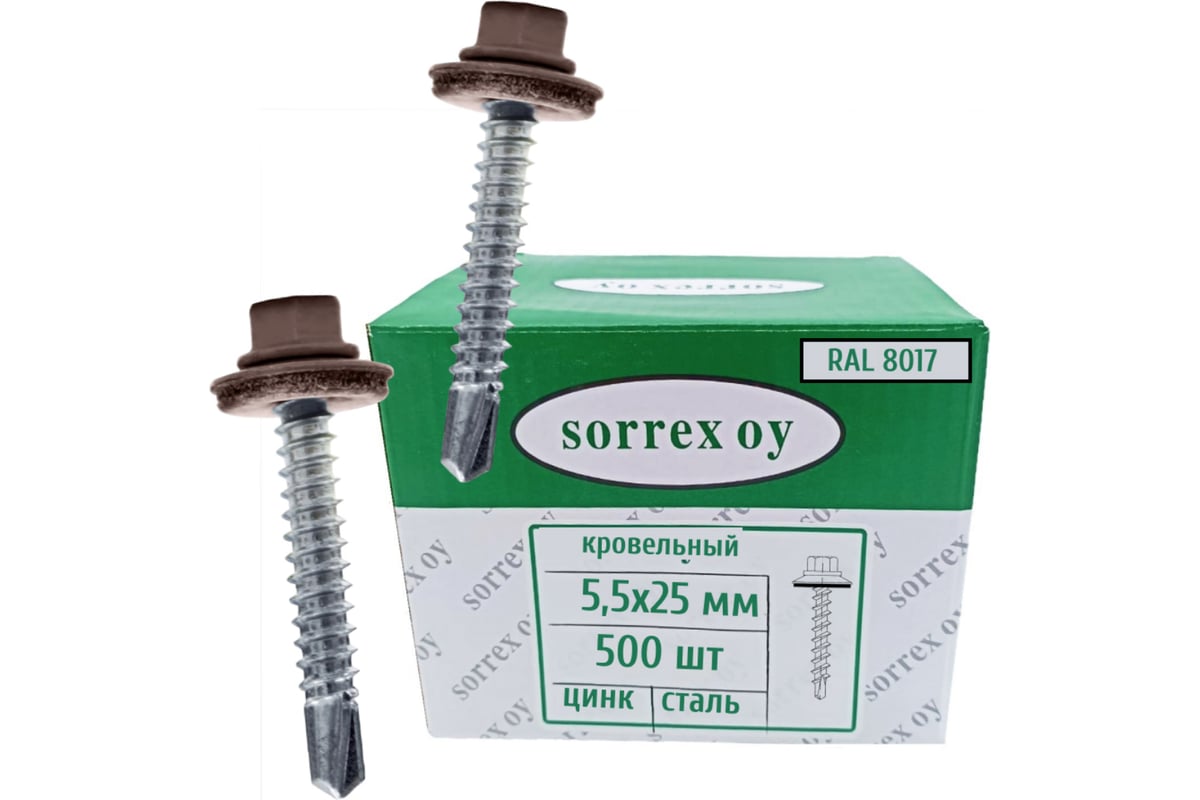 Саморезы кровельные со сверлом SORREX по металлу, оцинкованные, RAL8017 5,5x25 окрашенные, с пресс-шайбой, для профнастила и металлочерепицы, 500 шт. KRS-R8017-055-025 500