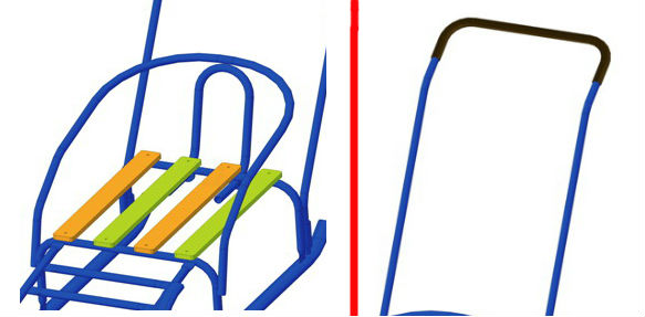 Санки Морозко 116 изготовлены из стальных труб, а полозья из плоскоовальной трубы. Применяются для прогулок или катания с гор с ребенком в зимнее время. Оснащены толкателем, который сверху покрыт резиновой накладкой для удобства управления санками. Спинка и ручка снимаются для катания с горы или для посадки двух детей. Выдерживают до 50кг.