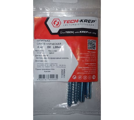 Сантехническая шпилька Tech-Krep/Zitar М8х80, 4шт - пакет 112232