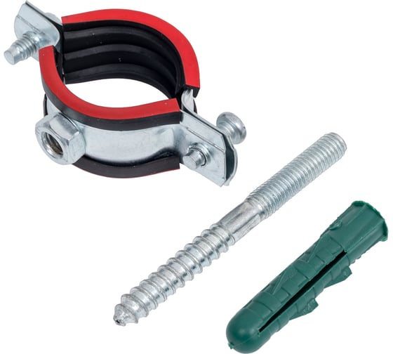 Сантехнический хомут с шурупом и дюбелем используется для крепления труб отопления и водоснабжения, канализационных труб, воздуховодов к стенам, как вертикально, так и горизонтально.