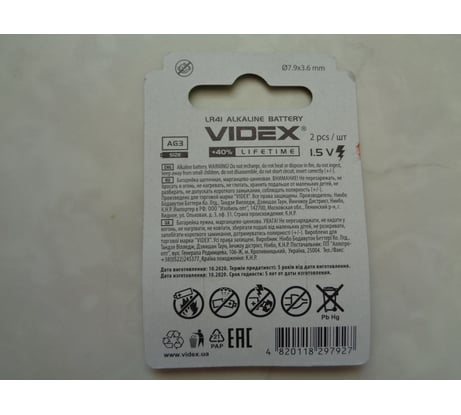 Отзывы о щелочной/алкалиновой батарейке VIDEX AG3/ 392/ 384/ LR41 2 штуки на блистере VID-AG03-2BC