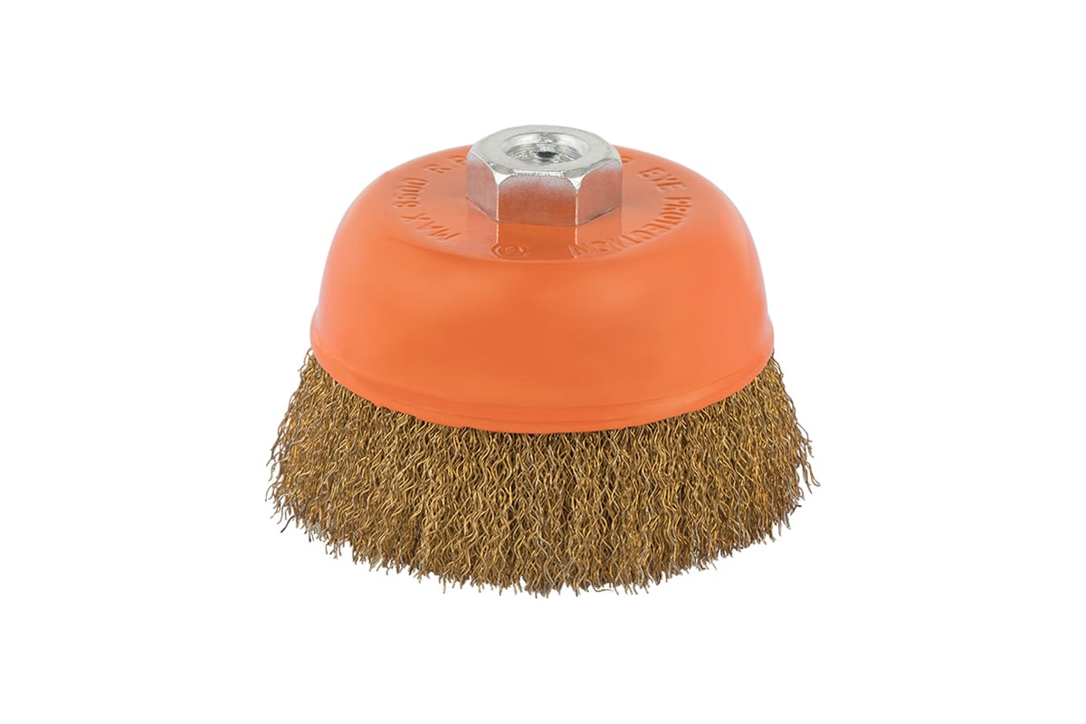 Щетка чашечная KENDO 76000429 диаметром 100 мм с гофрированной проволокой из латунированной стали предназначена для эффективной обработки различных материалов.