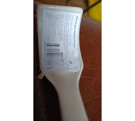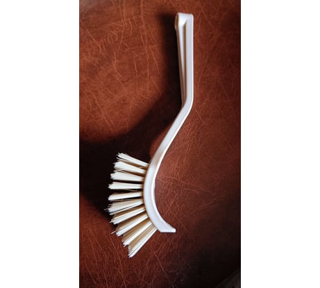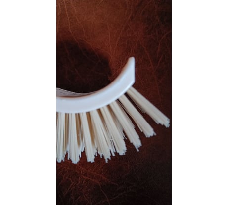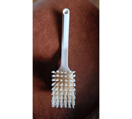 Хорошая щетка для посуды. В меру жесткая. Достаточно прочная. Изгиб над собственно щетиной - удобный упор для большого пальца, если надо сильно нажать. На конце есть скребок, не очень острый, но можно заострить, если очень надо. На конце ручки - отверстие для вешания на крючок. Мне было бы удобнее не отверстие, а крюк, чтобы вешать на угловую полку над раковиной. Но это нетрудно и самому сделать.