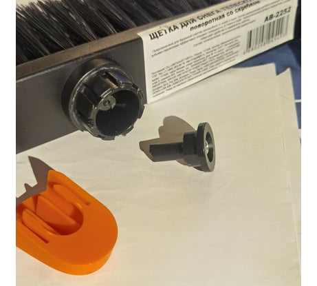 Скребок и сама щётка отстёгиваются от штока, что очень удобно для хранения и перевозки. Сам шток имеет треугольное сечение и при уборке снега щётка не проворачивается.