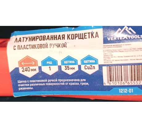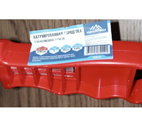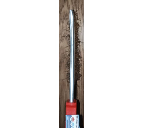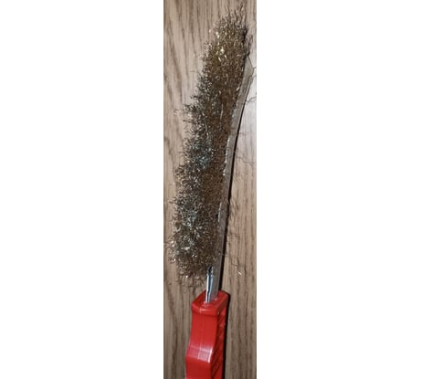 Она состоит из металлического корпуса и стальной латунированной рифленой проволоки. Пластмассовая рукоятка щетки имеет рифленую поверхность, что облегчает ее захват. Общая длина - 230 мм.