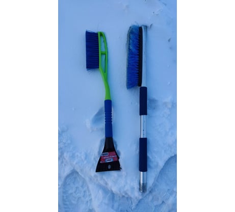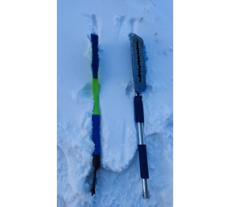 На фото слева новая щетка, справа - старая из 2004 года (потерял, купил новую, нашёл старую). Густота и длина щетины не годится для мужика, которому после хорошего снегопада надо быстро очистить машину. Детям её даю помогать и поиграть, женщине тоже сгодится. Скребком счищаю налипшую из-под колес грязь. Хилая щетина не позволяет разом смахнуть много снега. Длина рукоятки годится для совсем небольших машин (Ваз 2115 максимум).