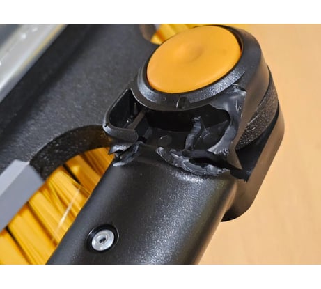Первое впечатление - мощная и крепкая щётка. С длинной рукояткой с мягким жёлтым покрытием, чтобы руки не мёрзли. НО почистить снег ею удалось раз 5. Потом сломался пластик в районе поворотного механизма. Пластик там тонкий, хрупкий, не морозостойкий.
