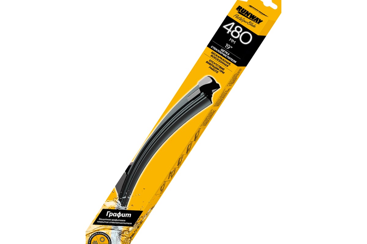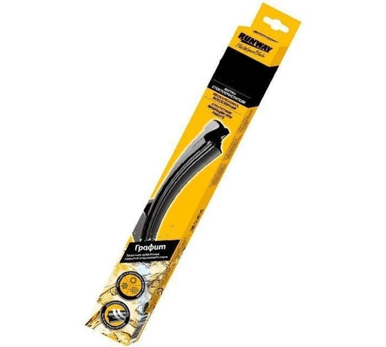 Преимущество.Всесезонность.Бесшумность работы.Без вибрации.Аэродинамический дизайн.Длительный срок службы.Высокий уровень качества.Конструкция Щетки стеклоочистителя RUNWAY бескаркасной с графитовым покрытием изготовлена по современным стандартам. Направляющая шина, расположенная внутри чистящего полотна, равномерно распределяет прижимное усилие, по всей длине точно повторяя рельеф щетки, что обеспечивает наиболее полное очищение стекла за один подход. Комплектация: 1 шт. щетка стеклоочистителя бескаркасная, 2 адаптера (Н23, В43)