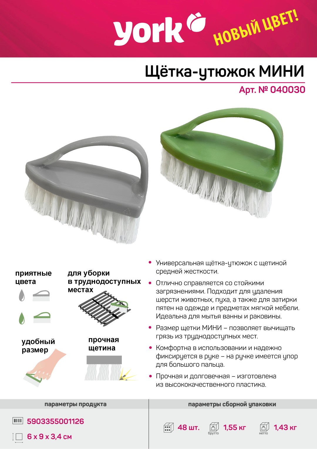 Щетка утюжок YORK Мини 040030 предназначена для чистки поверхностей.