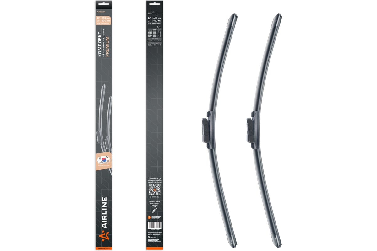 Щетки стеклоочистителя бескаркасные AIRLINE комплект 650/530мм (26/21) PREMIUM с креплением Push Button 16 мм, 2 штуки AWBM089
