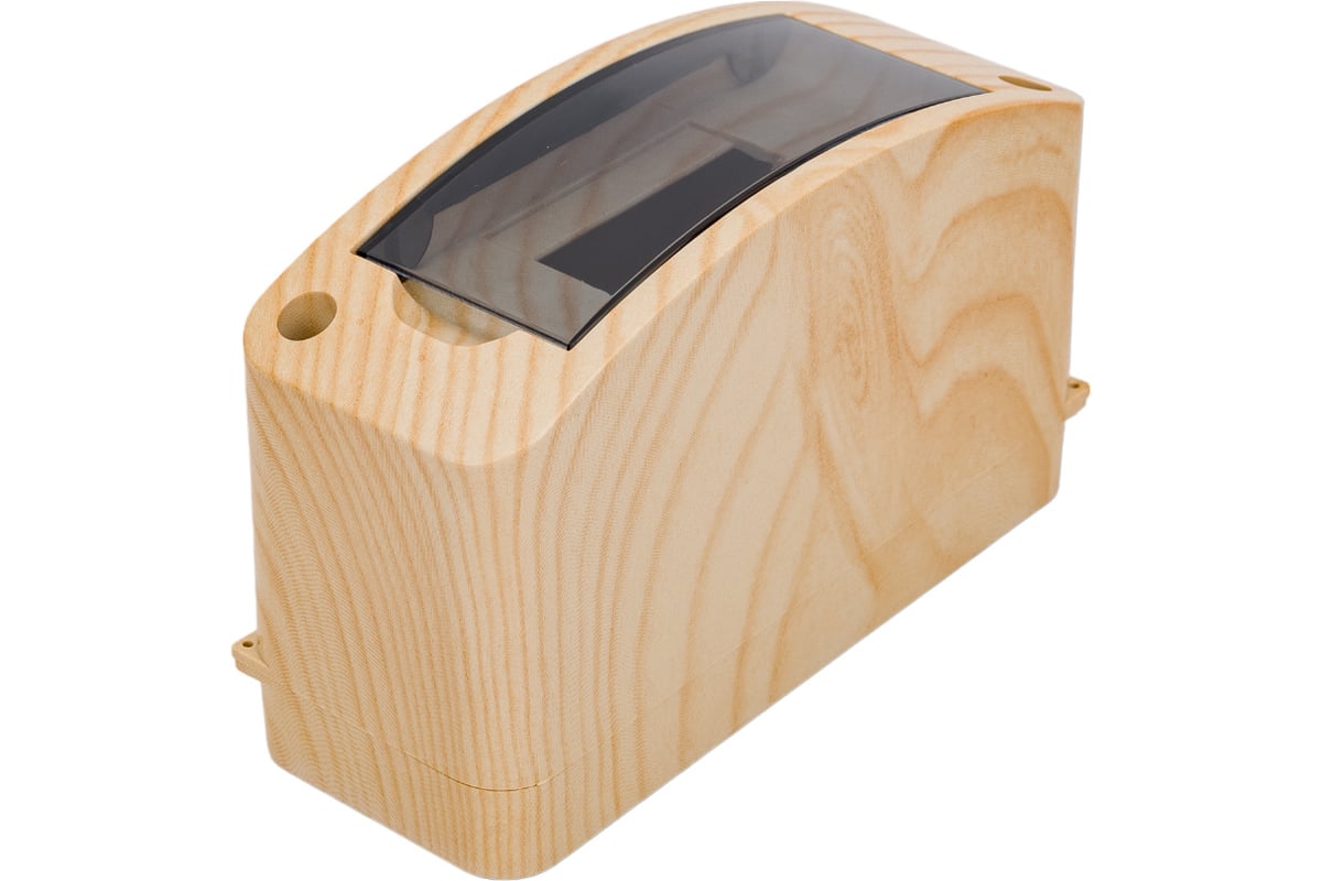 Имитация дерева. Шесть точек крепления, довольно прочная пластиковая din-рейка, выводы предусмотрены двойных размеров назад, вверх и вниз. С крышкой. Есть ушки для пломбировки (зачем?).