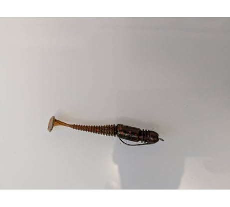 Гибридная приманка имеет червеобразное тело с характерным утолщением в передней части и небольшой хвостик-копытце от виброхвоста.