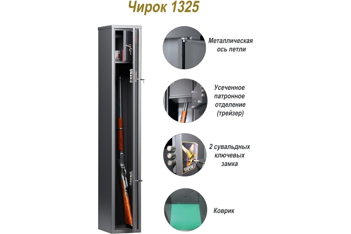 Сейф AIKO Чирок 1325 S11299103441 предназначается для хранения огнестрельного, охотничьего, гражданского оружия и патронов. Изделие имеет прочный металлический корпус с порошковым покрытием. Для надежности запирания предусматриваются два ключевых замка.