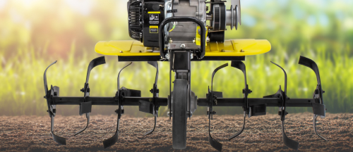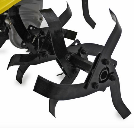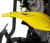 Наличие двух передач вперед, позволяет выбрать оптимальный режим вспашки, а режим заднего хода увеличивает маневренность машины. Все управление сосредоточено на рукоятке. Переднее колесо облегчает передвижение и служит опорой при стоянке и хранении. Съемные крылья надежно защищают оператора и двигатель от земли.
