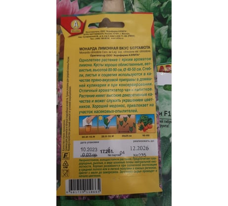 Удобная, симпатичная и очень качественная упаковка, хорошее описание особенностей растения и правил его выращивания и ухода. Четка видна дата упаковки и реализации, что не мало важно. Длинный срок реализации, вес семян 0,02 гр., но их количества достаточно, чтобы вырастить клумбу. Жаль, что именно этот сорт растения однолетний. Я не встречала в магазинах другого варианта «Монарды лимонной со вкусом бергамота», посадила, жду всходов.