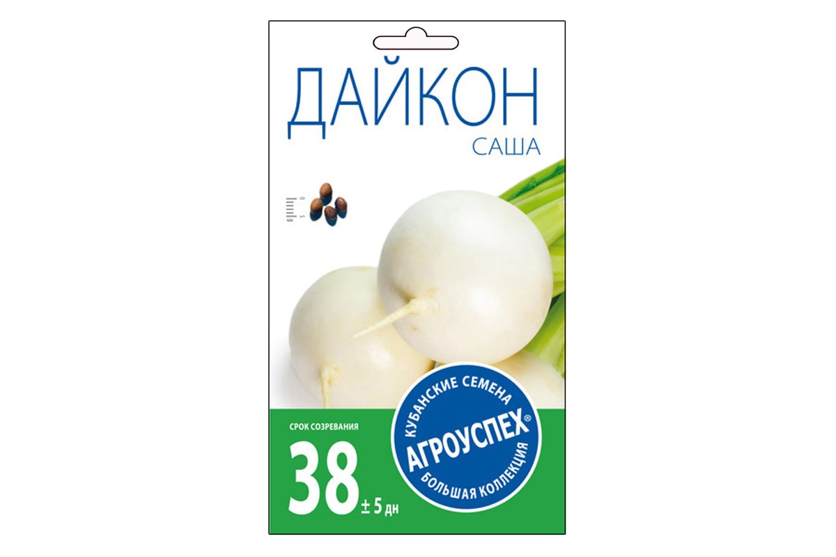 Семена Агроуспех дайкон Саша 1 г 17598 – скороспелый сорт, срок созревания примерно 38 дней. Плоды округлой или округло-овальной формы с гладкой поверхностью белого цвета. В длину корнеплод вырастает до 6-10 см, диаметр его середины 5-9 см. При таких размерах вес составляет 200-400 г.