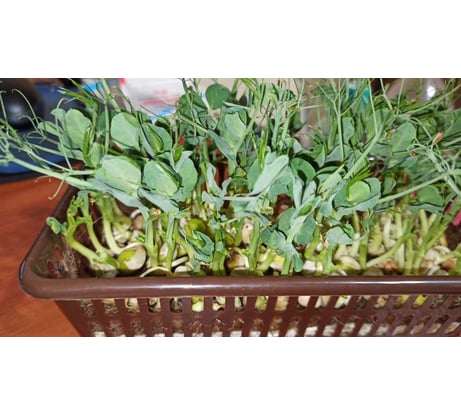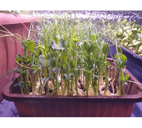 Отличный горошек, сочный. Садите в глубокие лотки не менее 10 сантиметров грунта. Что бы плесень не поражала ростки не держите в тепле, рядом с батареей, на солнце. Выгонка ростка в грунте только в прохладе, иначе плесень съест ваш горох на корню:))))