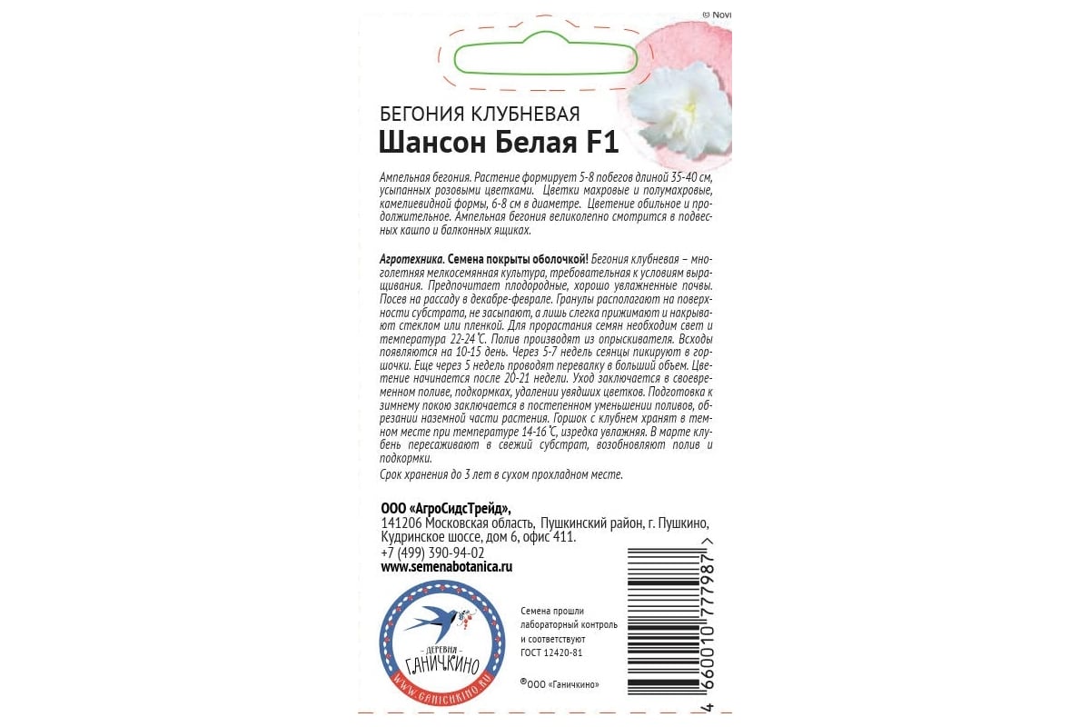Семена ОКТЯБРИНА ГАНИЧКИНА Бегония клубневая Шансон Белая F1 6 шт. 119644 применяются для выращивания на частном участке.