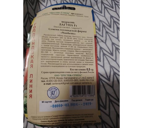 Семена Престиж-Семена Морковь Лагуна F1 00003256 подходят для выращивания на дачном участке.