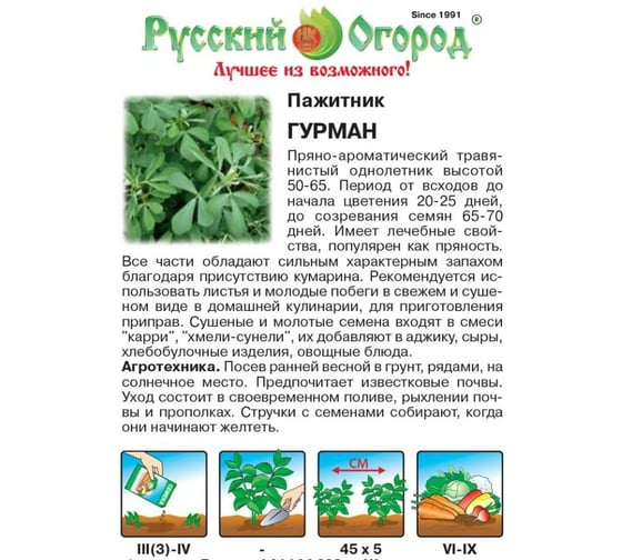 Семена РУССКИЙ ОГОРОД Пажитник Гурман 1 г 308140 подходят для выращивания на дачном участке.