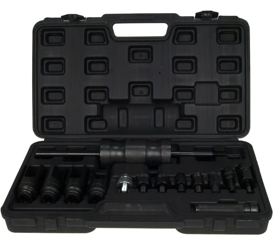 Специализированный набор на основе обратного молотка с комплектом из 14 адаптеров и захватов для безопасного и эффективного демонтажа «прикипевших» топливных форсунок Common Rail и других типов с головки блока цилиндров дизельных двигателей.