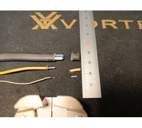 Сдирает изоляцию с проводов любого типа и даже с плоских кабелей в одно сжатие кисти не повреждая медные жилы. Приятный бонус — отчикивание шёлковых нитей у проводов типа МГШВ. На фото ниже 3 провода зачищенных этим съёмником в одно движение на одной настройке винта (!). Поразительное удобство работы. Правда такой тонкий МГТФ зачищает наоборот: изоляция снимается не слева направо, а справо налево. Связано с повышенной скользючестью фторопласта.
